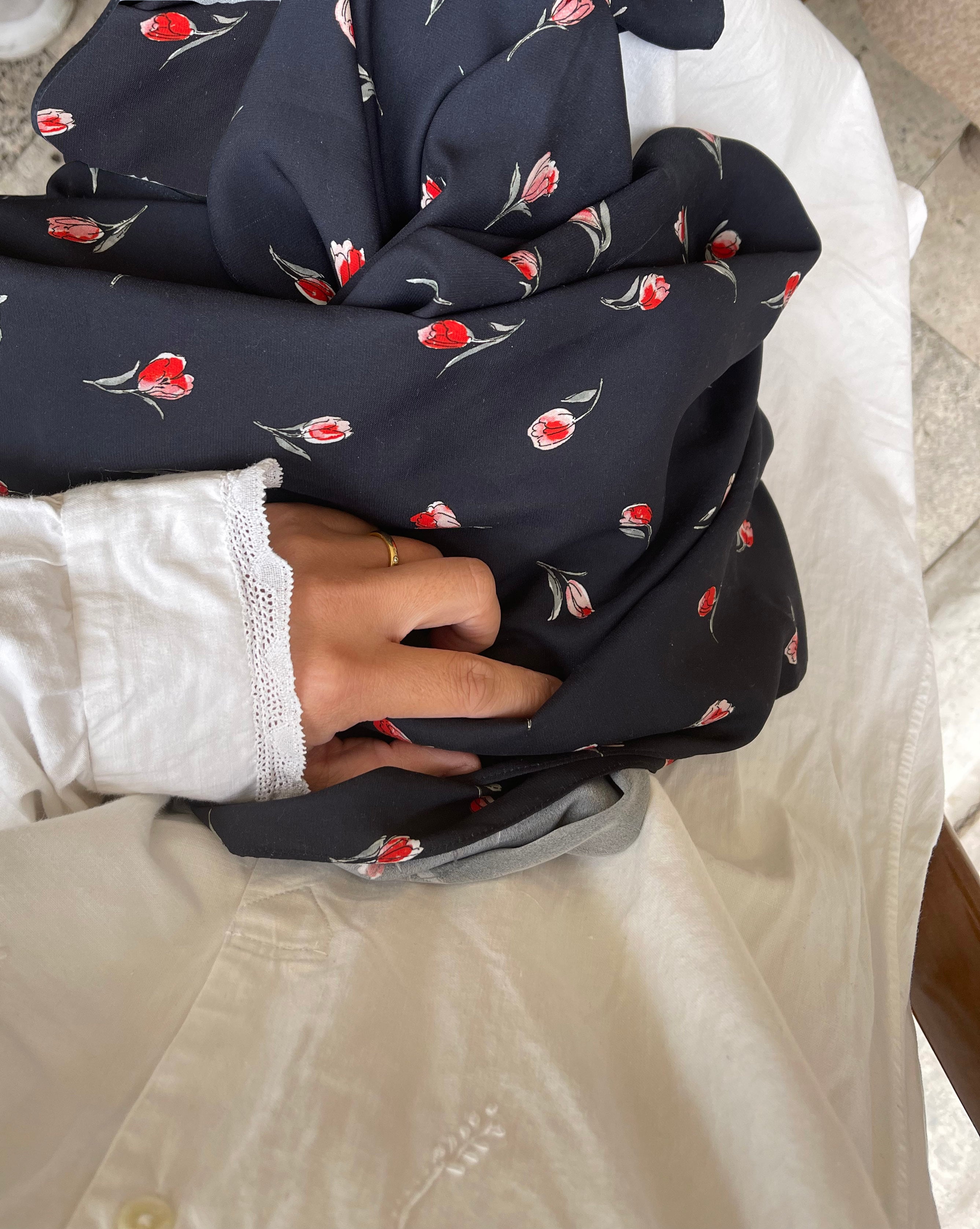 肌側にピーチ起毛を施したサテン生地は、リサイクルポリエステルを使用したサスティナブル素材。