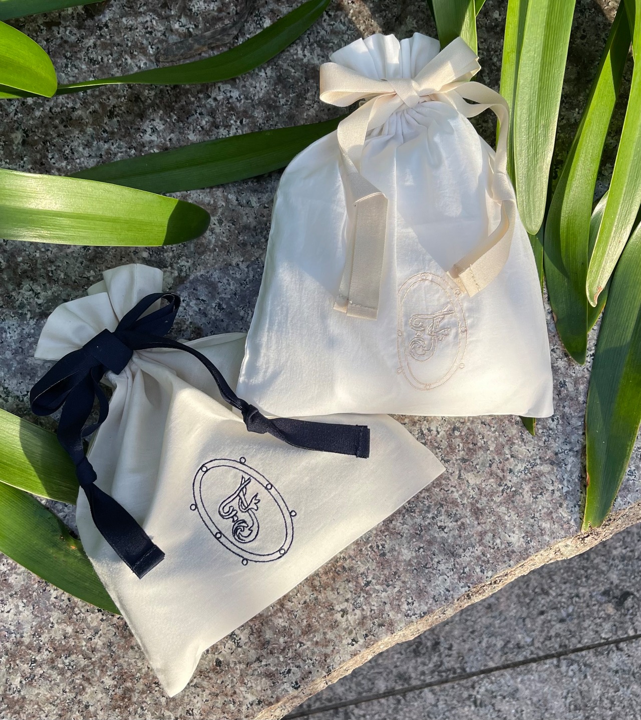 刺繍入りの巾着に入れてお届け致します。(ネイビーリボン)