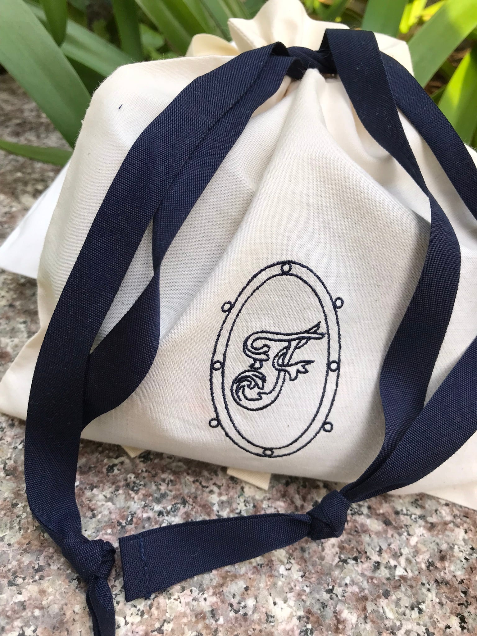 刺繍入りの巾着に入れてお届け致します。(ネイビーリボン)